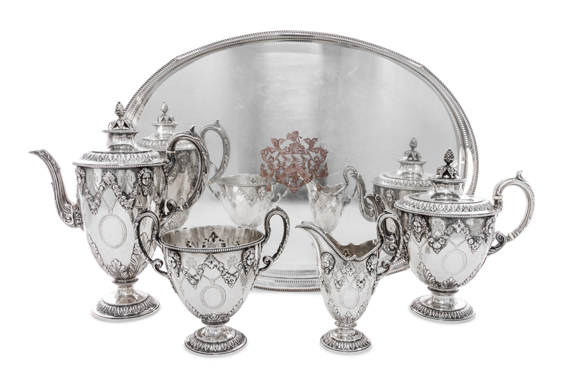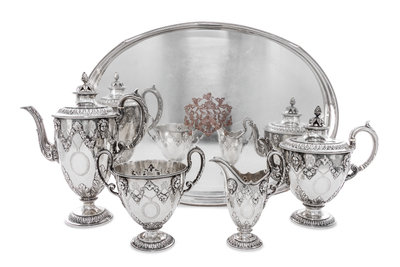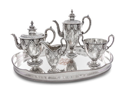 comprising a coffee pot, a teapot, a creamer and a sugar, the first two with insulators; together with an associated Sheffield silver-plate tray.