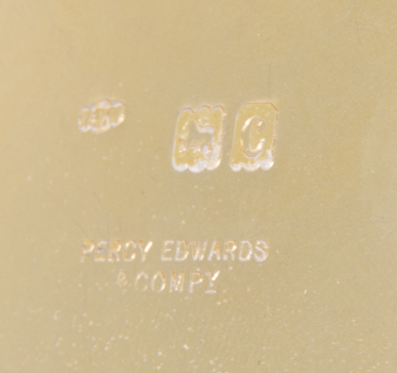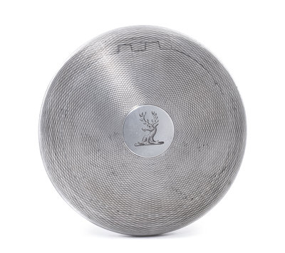of circular form with a hidden hinge lid, the exterior with engine turned decoration centered with an armorial crest, the interior gilt.