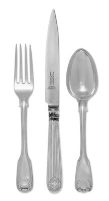 Fiddle, Thread and Shell pattern, engraved with various crests, comprising:12 dinner knives12 steak knives14 teaspoons12 dessert spoons12 soup spoons, 20th century21 lunch forks15 tablespoons14 dinner forks4 sauces ladles