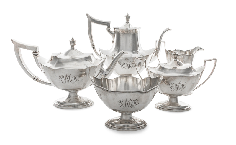 Plymouth pattern, comprising a tea pot, a coffee pot, a creamer, a covered sugar and a waste bowl, each monogramed LMK.