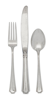 Fairfax pattern, comprising:11 luncheon knives8 luncheon forks9 salad forks9 tablespoons12 teaspoons12 butter knives10 oyster forks1 butter spreader6 serving articles