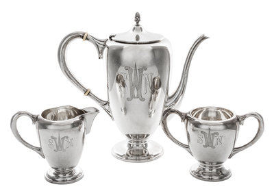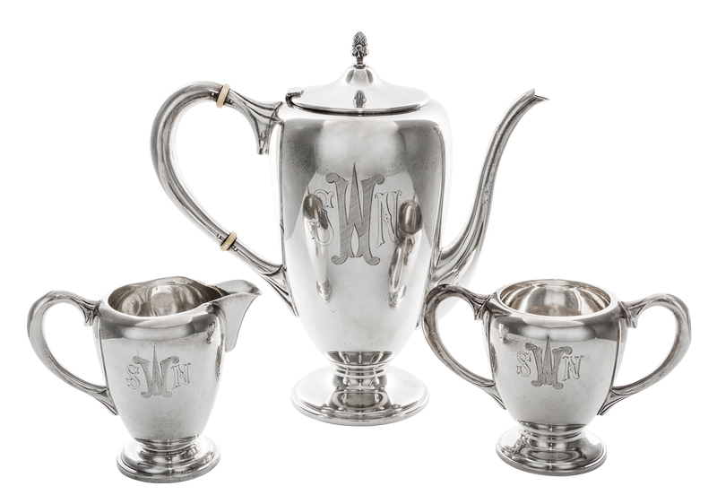 comprising a coffee pot, a creamer and an open sugar engraved with SNW monograms.