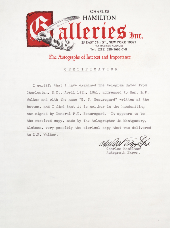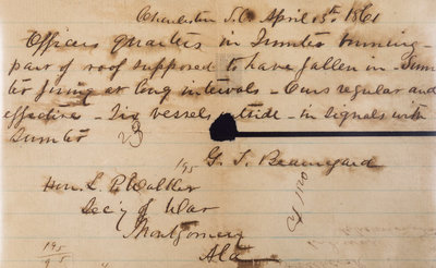 Manuscript telegram, sent from South Carolina, April 13, 1861, from General Pierre G.T. Beauregard to Hon. L.P. Walker in Secretary of War, Montgomery, Alabama. The telegram states: "Officers quarters in Sumter burning. Part of roof supposed to have fallen in. Sumter firing at long intervals. Ours regular and effective. Six vessels outside, in signals with Sumter." Likely the received copy made by the telegrapher in Montgomery, and very possibly the clerical copy delivered to L.P. Walker. Confederate troops, led by Gen. Beauregard, opened fire on Fort Sumter at 4:30am on April 12 against Union troops who had taken the Fort and refused surrender. Following a barrage of shelling, implied above, lasting 34 hours, the Union troops surrendered to Beauregard and his men, making the Battle of Fort Sumter the Confederacy's first success. On lined paper, split at the center crease 2/3 of the way through; loss to center of sheet; tape repair to verso.