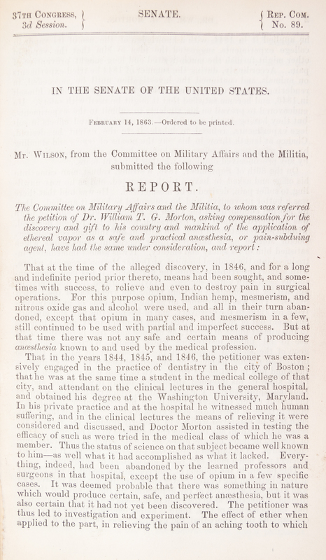 U.S. 37th Congress, 3d Session. Senate. Report [of] The Committee on Military Affairs and the Militia, to whom was referred the petition of Dr. William T. G. Morton, asking compensation for the discovery...of the application of ethereal vapor as a safe and practical anaesthesia... [Washington, D.C.: Government Printing Office,] 1863.8vo, bound in full black cloth, gilt-lettered spine. First edition, first issue of a report concluding that Dr. Morton was responsible for the surgical application of ether and entitled to be compensated accordingly. Light soiling to boards.