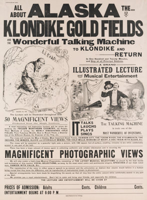 All About Alaska The Klondike Gold Fields and the Wonderful Talking Machine To The Klondike and Return... Chicago: Sears, Roebuck, n.d. [1898] Broadside advertising a lecture on the Alaska gold fields and an accompanying musical program. Framed.