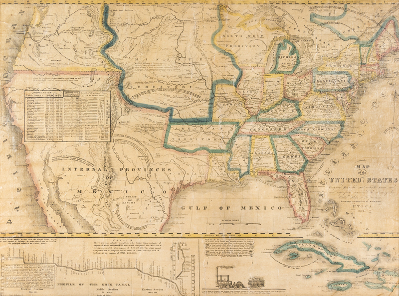 Map of the United States. Utica: M.M. Peabody, 1834. Engraved linen-backed map with hand-coloring in outline, linen-backed. With inset detail illustrations of the Erie Canal and the Island of Cuba. Framed.