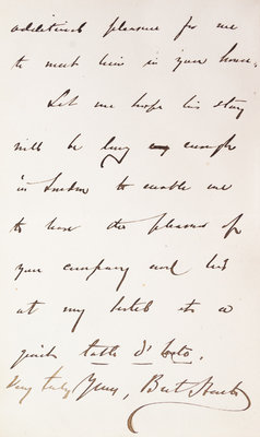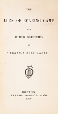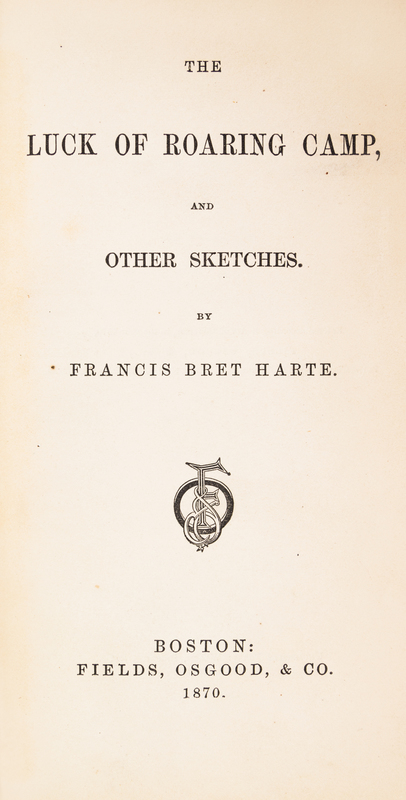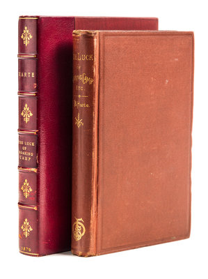 The Luck of Roaring Camp, and Other Sketches. Boston: Fields, Osgood, 1870.8vo, burnt orange cloth, gilt-lettered spine, housed in quarter morocco slipcase. First edition, first issue. With autographed letter signed ("Bret Harte"), two pages, Bailey's Hotel [London], n.d., tipped to f.f.e.p. To "Mr. Chatto" [possibly Andrew Chatto of Chatto & Windus], declining an invitation. Author George Barr McCutcheon copy, with his bookplate tipped to the front pastedown. Minor rubbing and edgewear to boards; inner hinges starting; few finger smudge marks to some leaves.