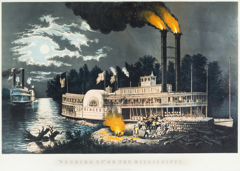 Wooding Up the Mississippi. New York, 1863. Lithograph with hand-coloring after the painting by Fanny F. Palmer. Framed and matted.