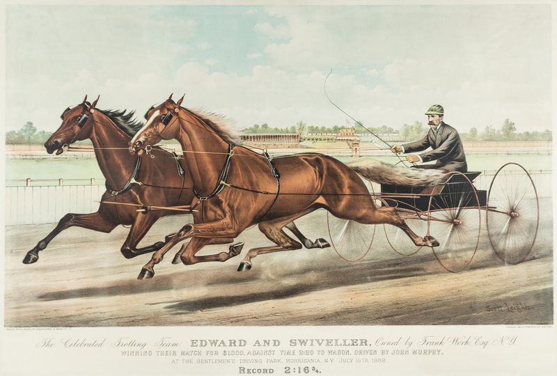 The Celebrated Trotting Team Edward and Swiveller. Owned by Frank Work, Esq. N.Y. Winning Their Match for $1,000, Against Time 2:20 to Wagon, Driven by John Murphy. At the Gentlemen's Driving Park, Morrisania, N.Y. July 13th, 1882. New York, 1882. Lithograph with hand-coloring after the painting by Scott Leighton. Framed and matted.