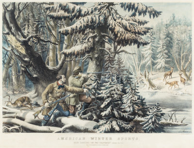 American Winter Sports. Deer Shooting "on the Shatagee" (Northern New York). New York, 1855. Lithograph with hand-coloring after the painting by Louis Maurer. Framed and matted.