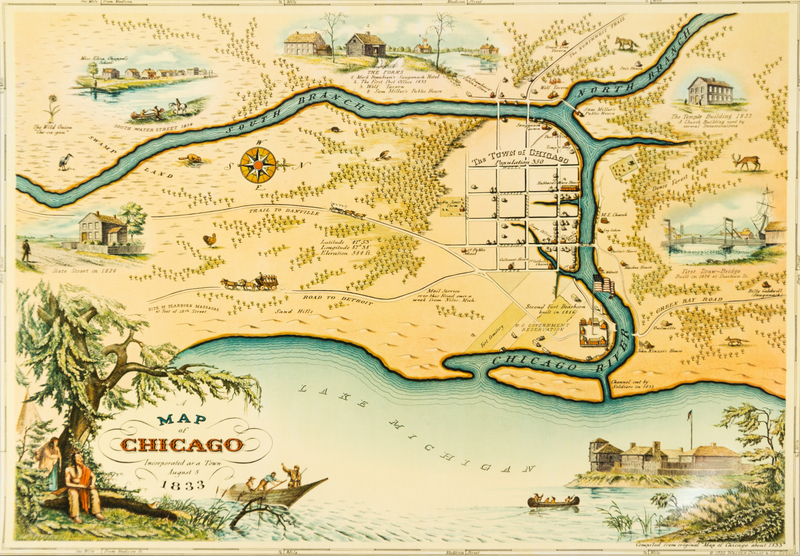 A Map of Chicago Incorporated as a Town, 1833. Chicago: Walter Conley & O.E. Stelzer, 1933. Color lithographed map "compiled from original 'Map of Chicago about 1833'" of Chicago at the time of its incorporation.