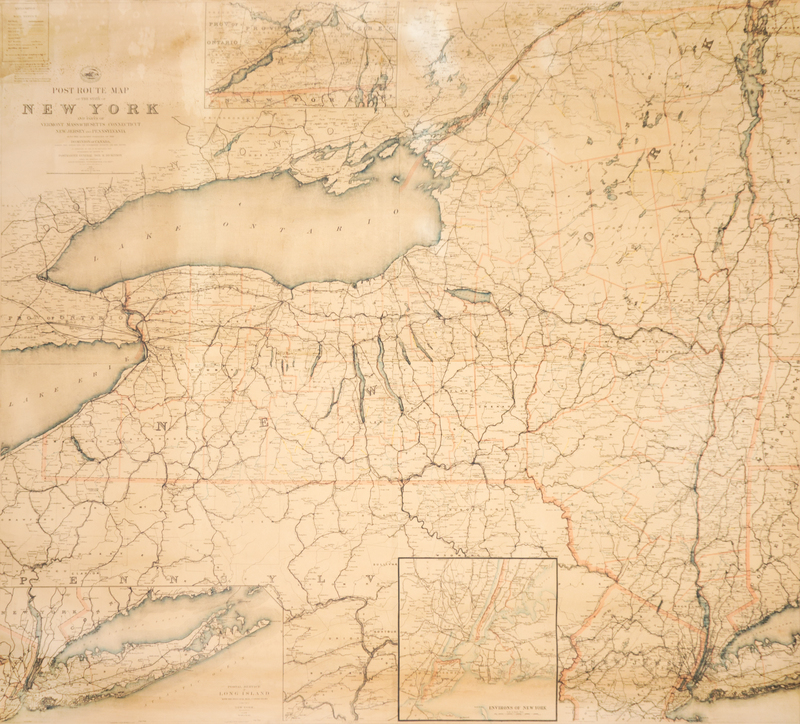 Post Route Map of the State of New York and Parts of Vermont, Massachusetts, Connecticut, New Jersey, and Pennsylvania also the Adjacent Portions of the Dominion of Canada, Showing Post Offices with the Intermediate Distances and Mail Routes in Operation on the 1st of October 1891. New York, 1891. Large linen-backed color engraved wall map with wooden wall mounts.