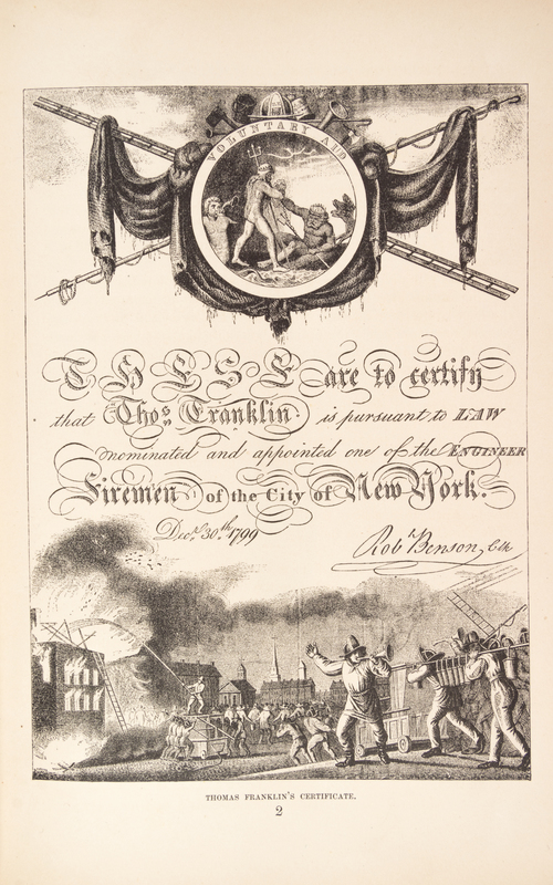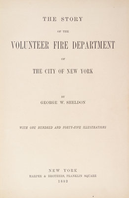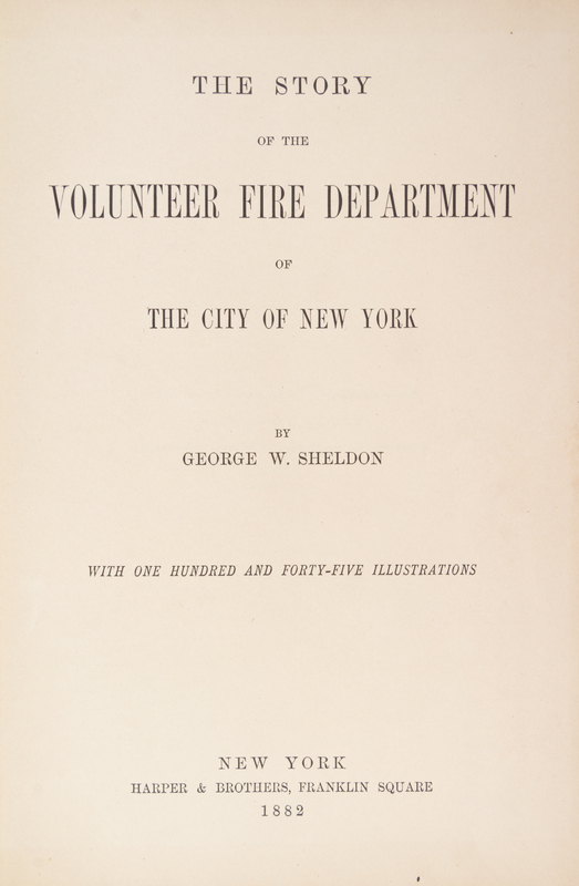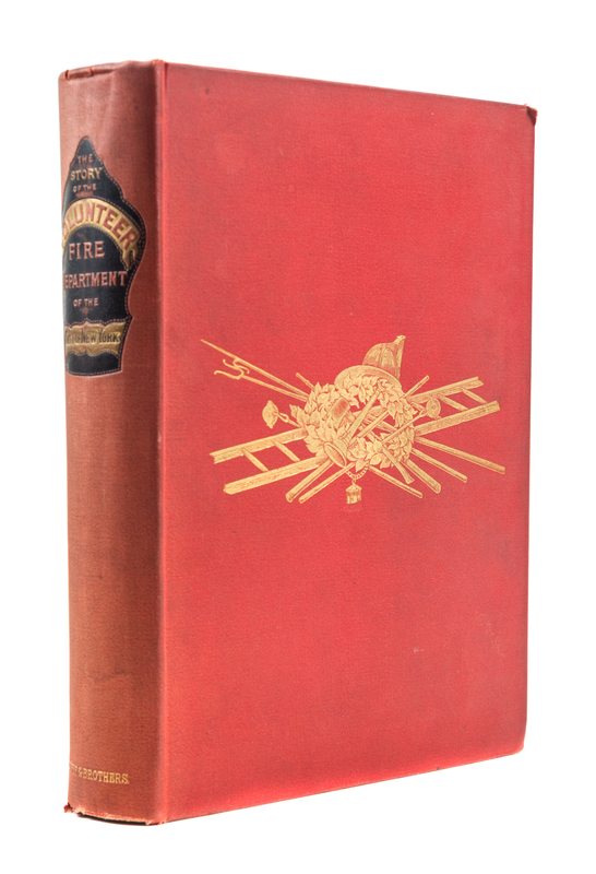 The Story of the Volunteer Fire Department of the City of New York. New York: Harper & Brothers, 1882. 8vo, pictorially gilt-stamped red cloth. First edition. Light soiling to boards; spine faded; hinges starting.