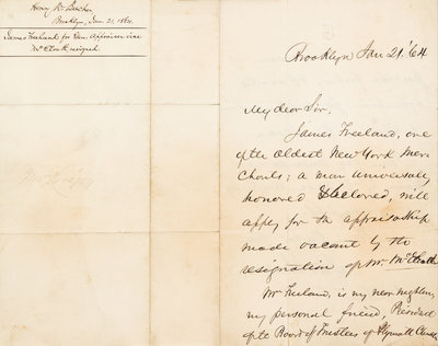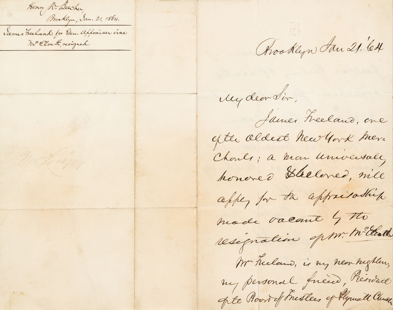 Autographed letter signed ("H.W. Beecher"), two pages, on a bifolium, Brooklyn, January 21, 1864. Beecher recommends a colleague, James Freeland, to an unknown position.