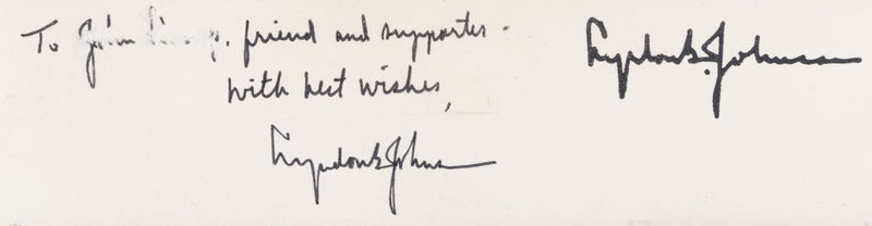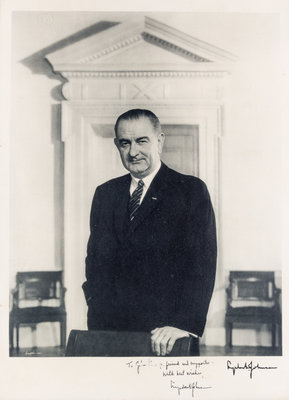 Large black and white photograph by Arnold Newman signed and inscribed ("To John [illeg.], friend and supporter - with best wishes, Lyndon B. Johnson.") S.l., n.d. Framed. Name in dedication obscured; light overall soiling.