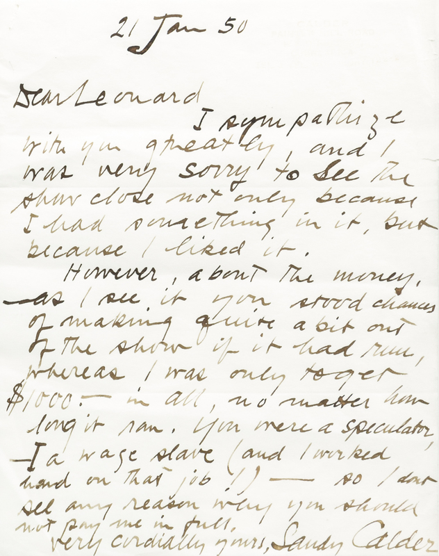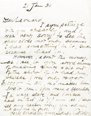 Autographed letter signed ("Sandy Calder"), one page, s.l., January 21, 1950. To Leonard [Horwich?] expressing sympathy over the premature closing of an art show in which Calder's work was featured, and stating that he believes he should still be paid the full commission of $1,000 for exhibiting. Floated on mat and framed.