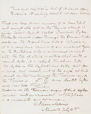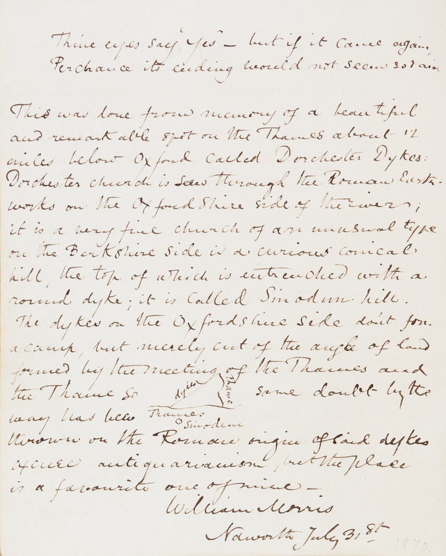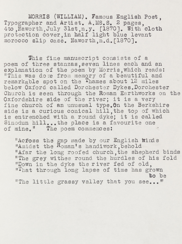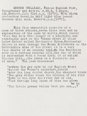 Autograph manuscript poem, untitled, with explanation of the poem by the author, signed ("William Morris"), Naworth, n.d. [1870] 2 pages, three stanzas, 21 lines (poem). Housed in custom blue cloth chemise and slipcase, gilt-lettered. Slipcase faded and slightly worn.