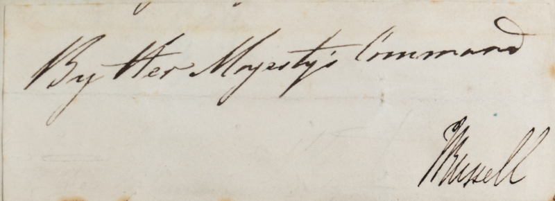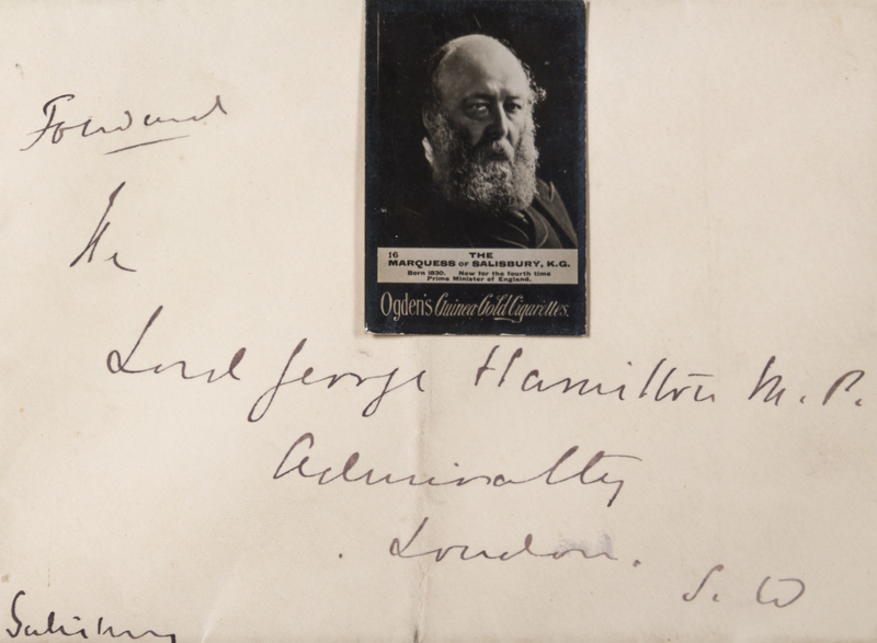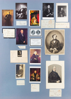 A collection of 10 clipped signatures and inscriptions of British politicians mounted to board, framed with accompanying reproduction portraits of the signers, including Benjamin Disraeli (inscription), Henry John Temple, 3rd Viscount Palmerston (signature, "Palmerston"), Robert Peel (inscription) Lord John Russell (signature), William Gladstone (signature), Lord George Hamilton, Marquis of Salisbury (inscription), Lord Stanley (signature), Lord Rosebery (signature), William Lamb, Lord Melbourne (signature), and George Hamilton-Gordon, Earl of Aberdeen (inscription).