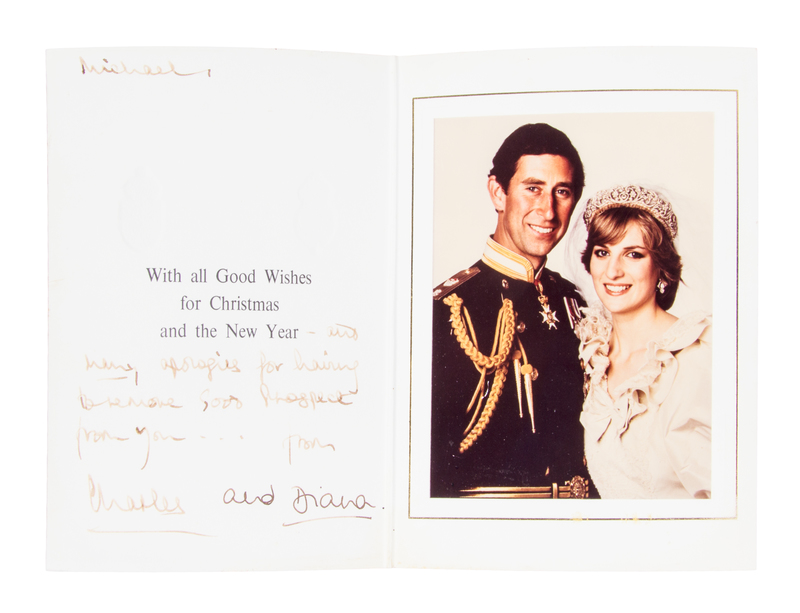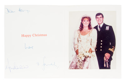 Autograph Christmas card signed ("Charles" and "Diana"), n.d. [c. 1981], matted with color photograph of both in white card with gilt-embossed royal seals to front.[Together with:] Christmas card signed by Prince Andrew and Sarah, Duchess of York.