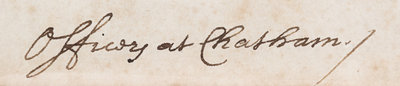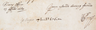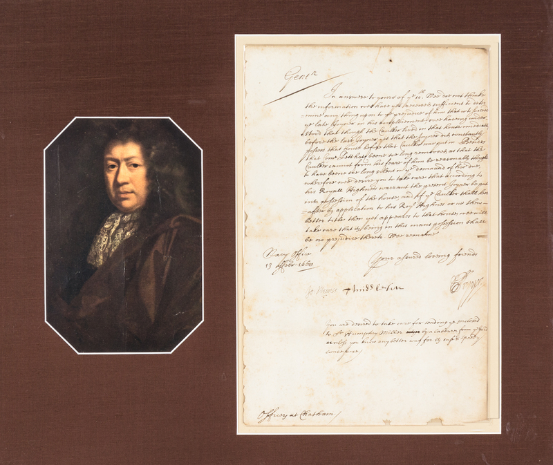 Autograph letter signed ("Pepys"), one page, Chatham, February 13, 1668. Countersigned by officers Middleton and Mennes. To an unidentified group of gentlemen, confirming insufficient evidence prohibits him from determining anything in a case in which his correspondents are involved. Framed and matted.