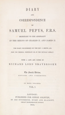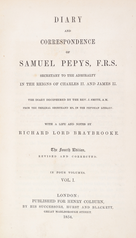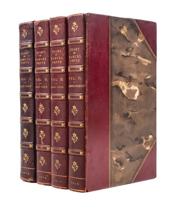 Diary and Correspondence of Samuel Pepys, F.R.S. London: Henry Colburn, 1854.4 vols. 8vo, bound by Root & Son in 3/4 red morocco over marbled boards, gilt-stamped and -lettered spines, t.e.g. Fourth edition, revised and corrected, with a life and notes by Richard Lord Braybrooke. Illustrated throughout with steel-engraved plates and facsimiles, some fold-out. Some darkening to boards; edgewear; offsetting from plates; scattered foxing.