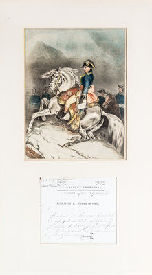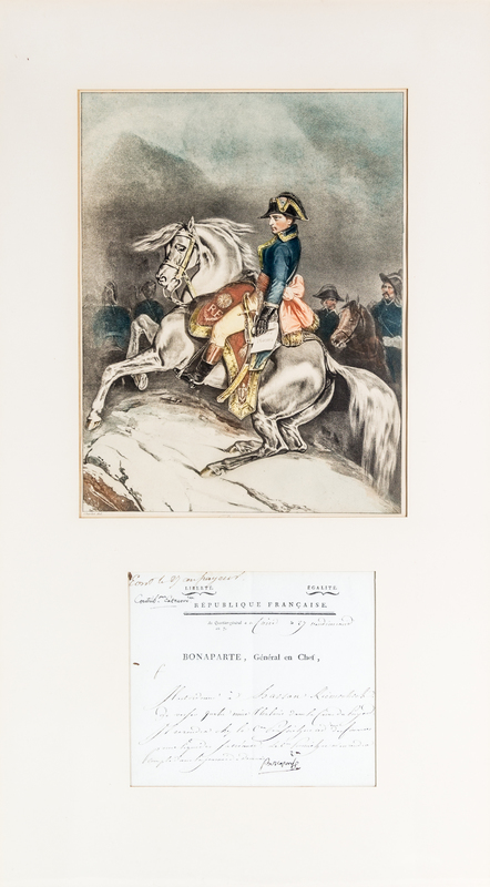Document signed ("Bonaparte"), in a secretarial hand, one page, on official Republique Francaise letterhead, Vendemiaire (September) 27, an 7 (1798). Framed and matted with reproduction color portrait of Napoleon.