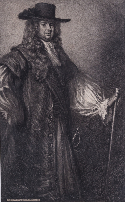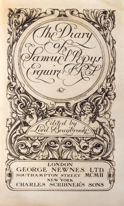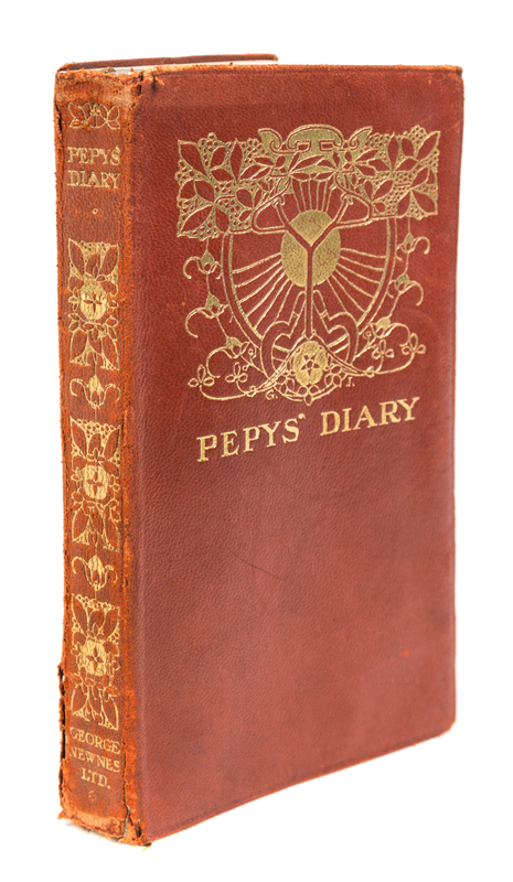 Original drawing for the frontispiece of The Diary of Samuel Pepys. S.l., n.d. [c. 1900] Framed and matted.[Together with:] The Diary of Samuel Pepys, Esquire, F.R.S. Edited by Lord Braybrooke. London: George Newnes, 1902. Small 8vo, gilt-stamped and -lettered red calf. With the Sullivan frontispiece. Rubbing to boards at spine.