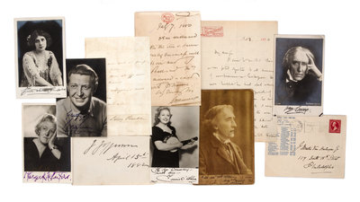 A group of 11 documents signed by American and British actors and actresses including Joseph Jefferson, Fanny Kemble, Tessie O'Shea, Mrs. Patrick Campbell, Margaret Rutherford, Sir Squire Bancroft, Sir Henry Irving, and Roger Livesey.