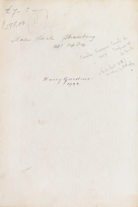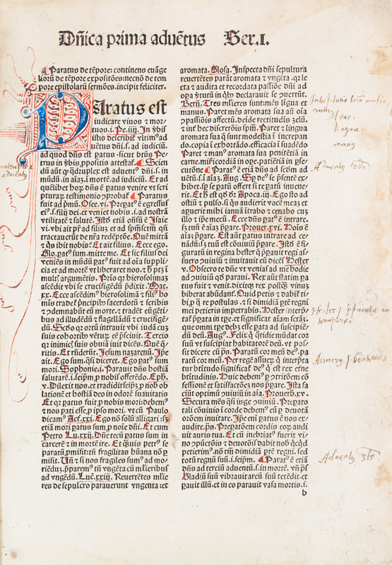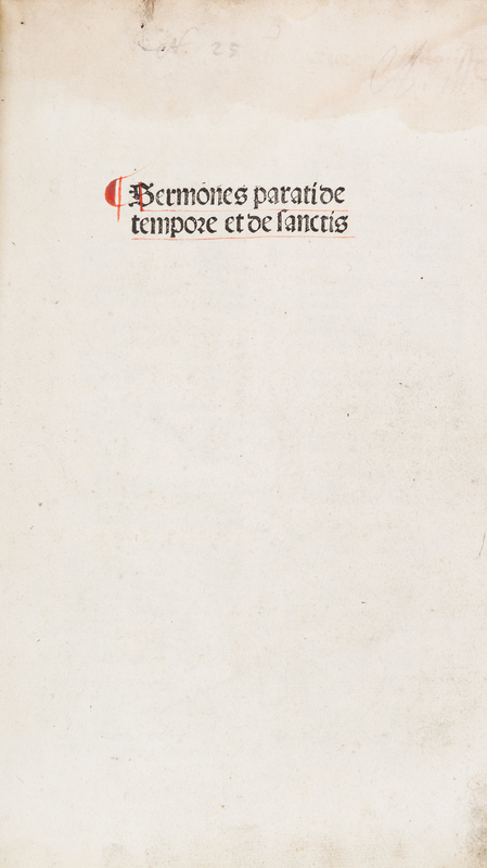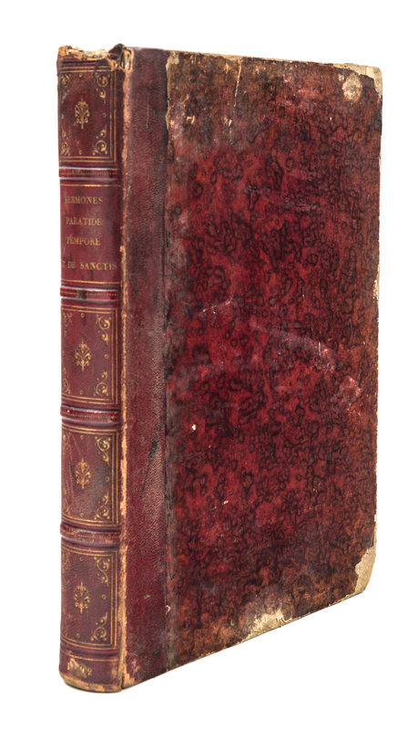 Sermones Parati de tempore et de sanctis. Strassburg: [Martin Flach, c. 1490]4to, 200 leaves, rebound in modern quarter maroon morocco over marbled boards, gilt-tooled and -lettered spine. Double-column text, 50 lines, with initials, paragraph-marks, initial-strokes and underlines supplied in red and blue, by hand. Wear and soiling to boards; minor dampstaining to some leaves; intermittent marginalia; brownspotting.