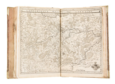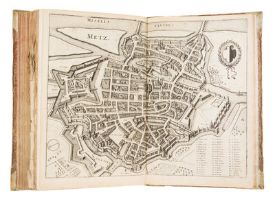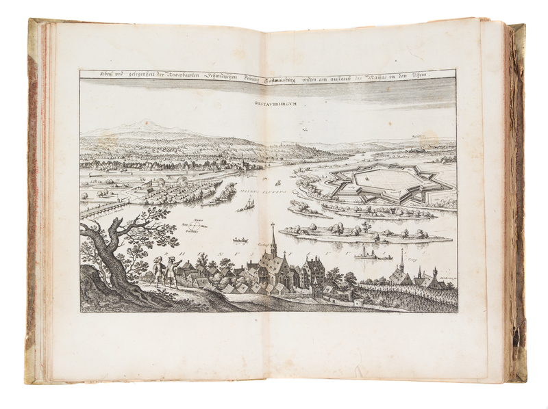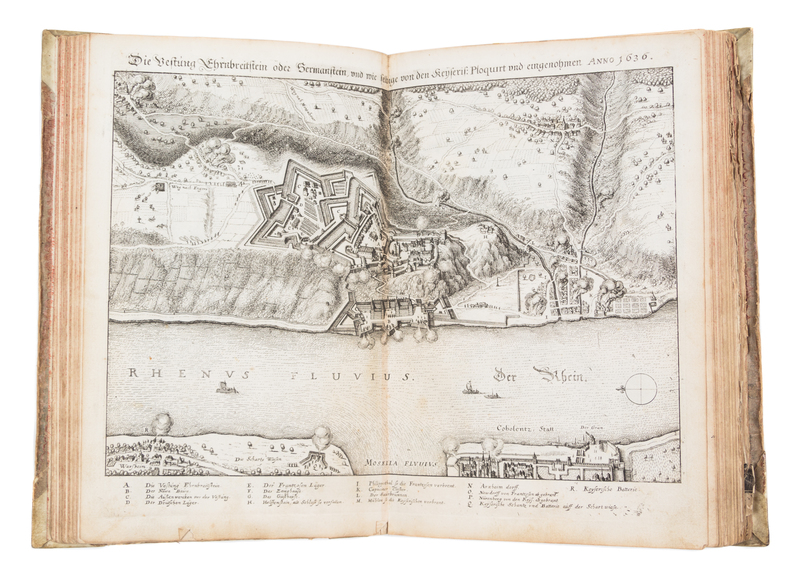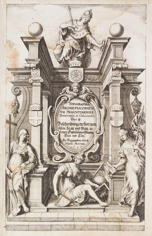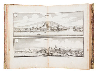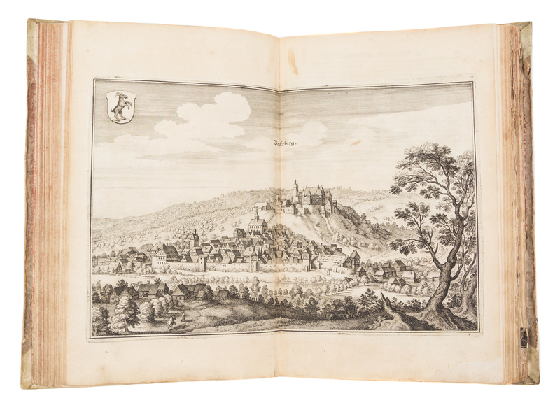 Topographia Archiepiscopatuum Moguntinensis Treuirensis et Coloniensis das ist Beschreibung denen Ertzbistumen Mayntz, Trier und Coln. Frankfurt, 1646 [but 1675] [Bound with:] Topographia Palatinatus Rheni et Vicinarum Regionum... Frankfurt, 1645. [and] Suegab/ Don etlichen de Henl. Rom. Reichs... Frankfurt, n.d.ii, 54 [8] pages (Moguntinensis); ii, 67 [2] pages (Palatinatus); v, 17 [1] pages (Suegab). 3 vols. in one. 4to, full vellum. With three engraved title pages and 102 engraved plates. First edition of the first title. Boards rubbed and soiled; intermittent foxing and brownspotting; most plates chipped or torn; some plates or text leaves detached; repaired tears to some plates. Full condition report available upon request.