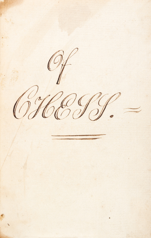 Morals of Chess By Benjamin Franklin, handwritten in an early hand, possibly eighteenth-century, 11 pages, s.l., n.d. [Bound with:] The History of Chess, together with Short and Plain Instructions... London: J. Wilkie, 1765. 8vo, rebound in 3/4 calf over marbled boards, gilt-lettered spine. With one folding plate to "History." Minor wear to boards; scattered spotting.