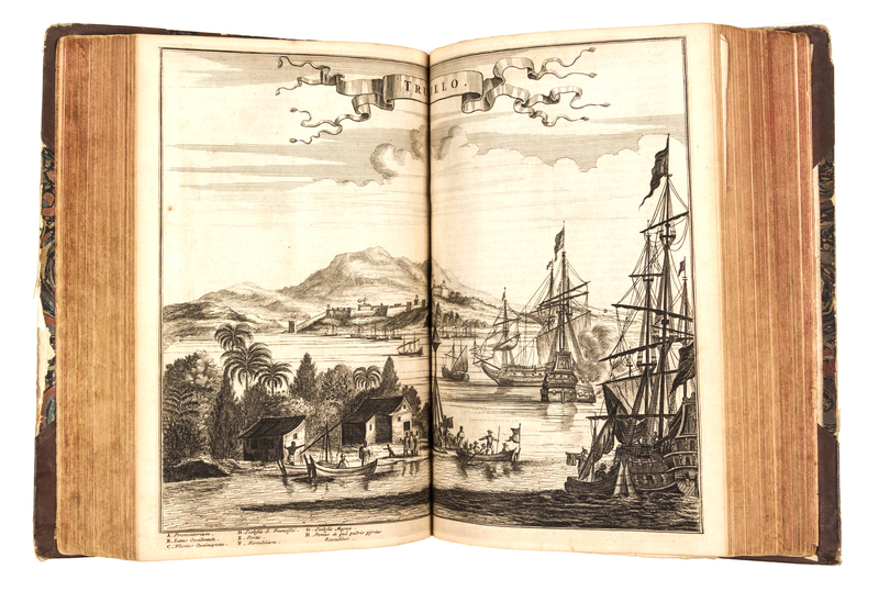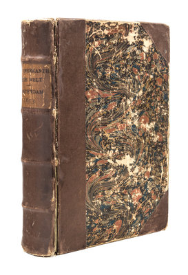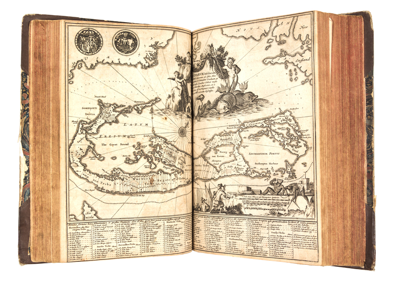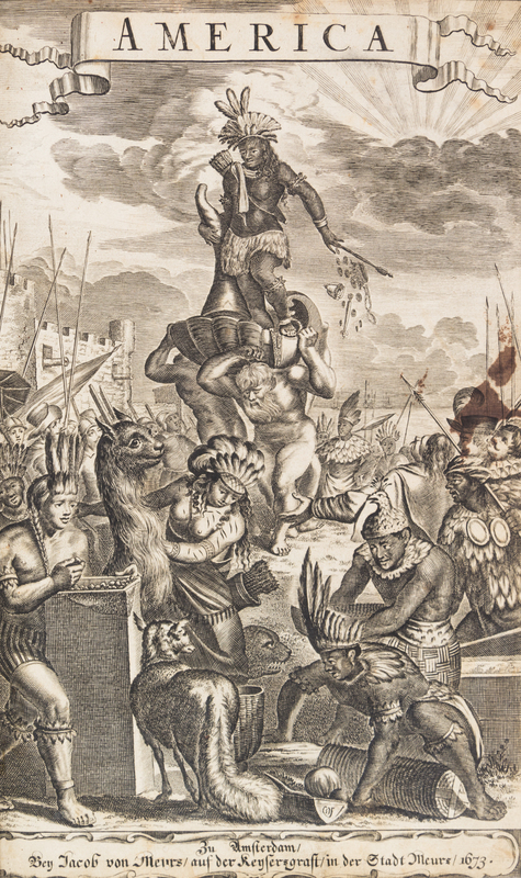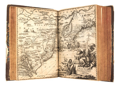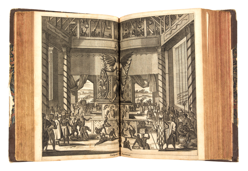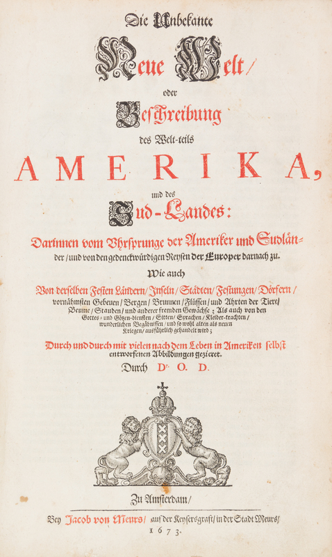 Die unbekante neue Welt, oder Beschreibung des Welt-teils Amerika, und des Sud-Landes... Translated by Olfert Dapper. Amsterdam: Jacob von Meurs 1673. ii, [4] 658 [22] pages. 4to, rebound in 3/4 brown cloth over marbled boards. First German edition of what is also known as Ogilby's "America." With extra-engraved title, numerous in-text engravings, four (of six) portraits, 21 (of 32 double-page views, one fold-out), and 15 (of 16) double-page maps (lacking fold-out map). Boards worn and threatening to detach; evidence of removal of bookplate from front pastedown; intermittent brownspotting; marginal chipping to some plates; darkening to some leaves.