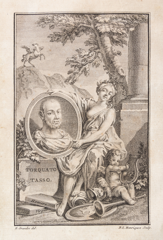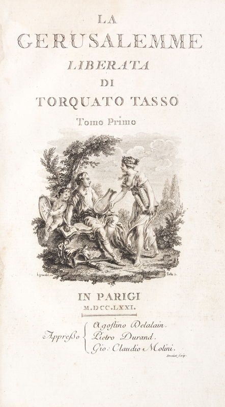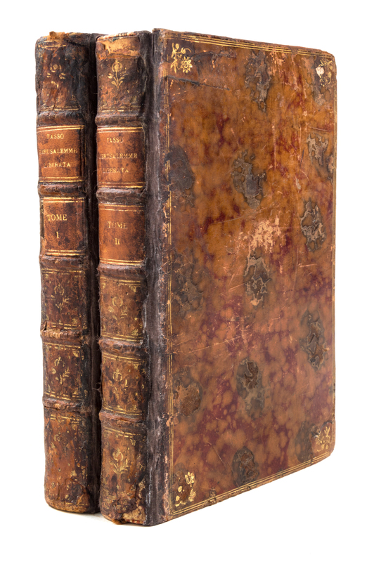 La Gerusalemme liberata. Paris: Olgostino Delalain et al., 1771,2 vols. 8vo, gilt-stamped mottled calf, rebacked. With two frontispieces, two engraved vignettes to title pages, engraved dedication, and 20 engraved plates. Wear and rubbing to boards; ephemera tipped to f.f.e.p., vol. 1; light offsetting from plates; scattered brownspotting.
