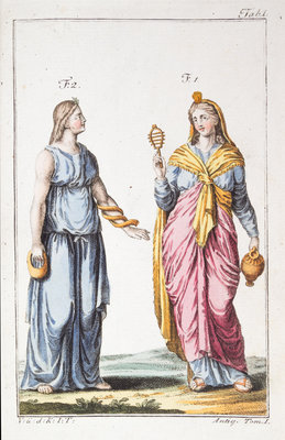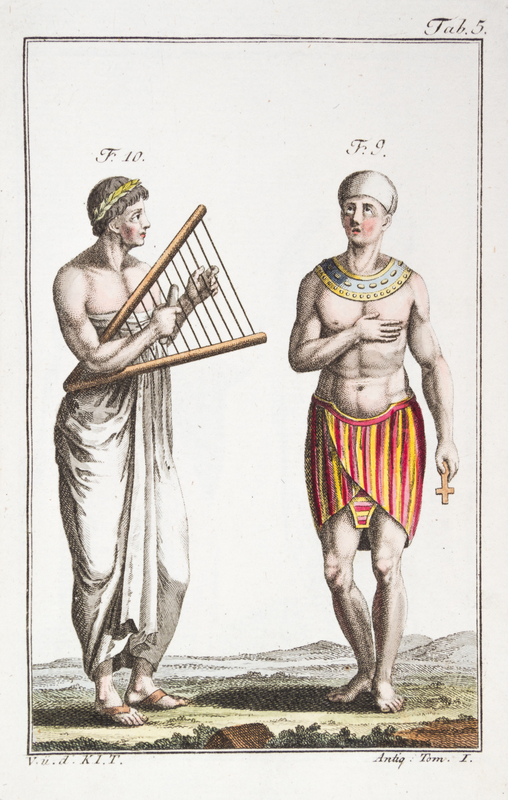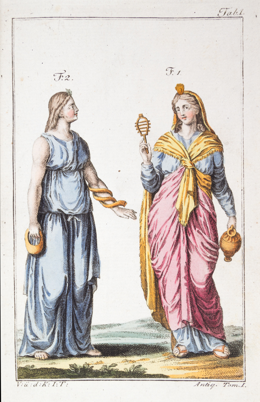 A bound collection of 27 hand-colored engraved plates from Costume des antiques, n.d. 8vo, calf, gilt-lettered spine.