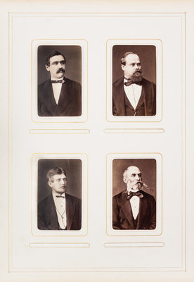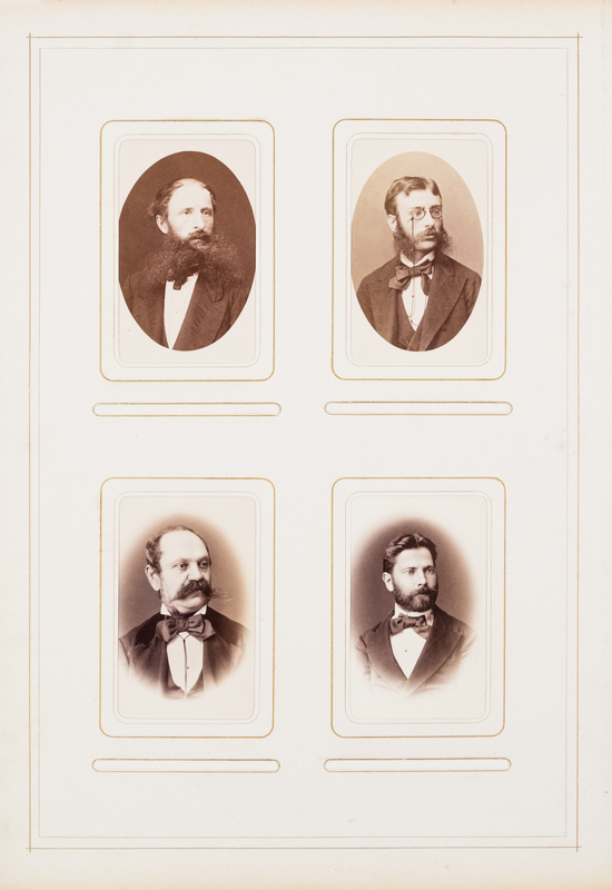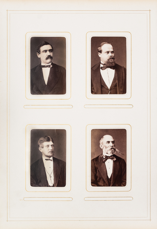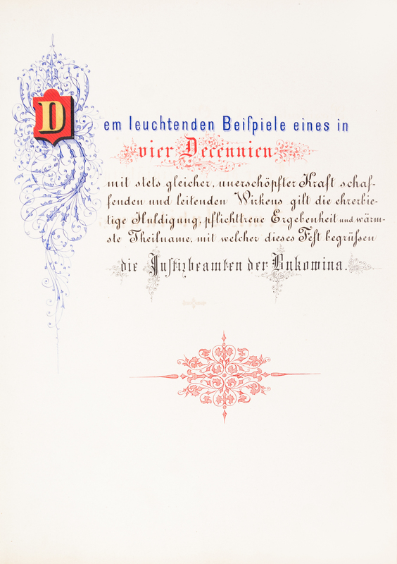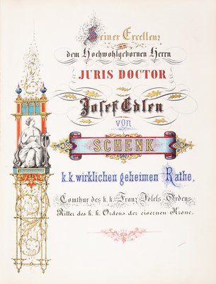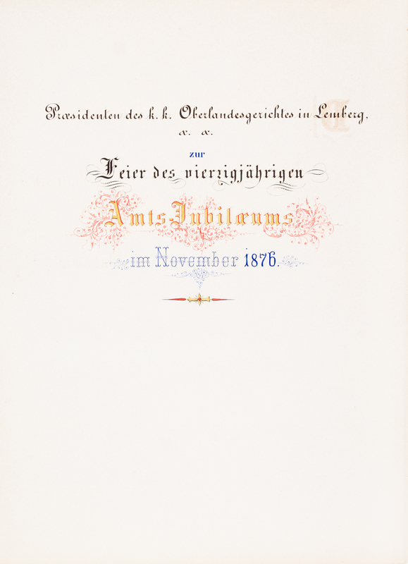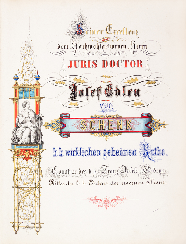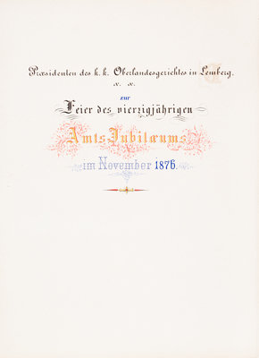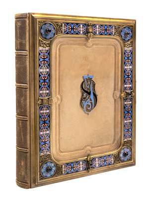 Seiner Excellenz dem hochwohlgebornen... [Commemorative Album, 40th year of the Higher Regional Court, Liev, November, 1876] Liev: s.n., 1876. Folio, finely bound by M. Klein in full tan morocco with brass onlay to borders of boards, brass to upper board inlaid with blue, pink, green, white, black, and gold enamel, with six inlaid black stones to corners and edges, decorative blue and black enamel initials "SJ" to center of upper board, blue silk endpapers, brass clasp inlaid with enamel, a.e.g. Illuminated title and dedication pages. With 106 inserted black and white albumen portrait photographs of members of the Liev Higher Regional Court, primarily by Photographisches Atelier Der Gebriider Konig in Czernowitz (printed on rear of photographs). Light soiling and rubbing to calf; inner hinge cracked; few scattered brown spots; some portraits faded.