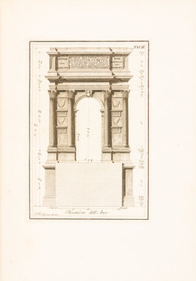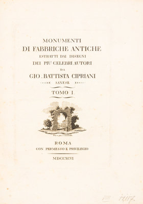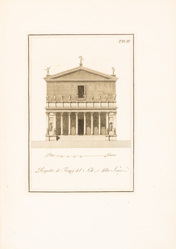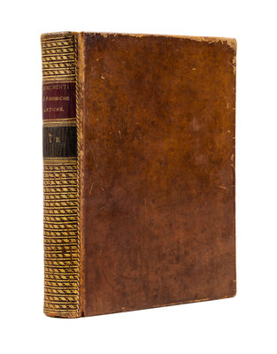 Monumenti di fabbriche antiche estratti dai disegni dai piu celbri autori. Rome: Con Permesso E Privilegio, 1796.Vol. 1 (of 3) only. 4to, full calf, gilt-stamped and -lettered spine, red calf spine label. With 122 engraved plates (one fold-out). Light wear to boards; spine slightly chipped; bookseller's ticket tipped to front pastedown; scattered light brownspotting; minor offsetting from plates.
