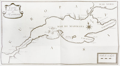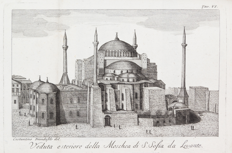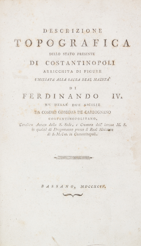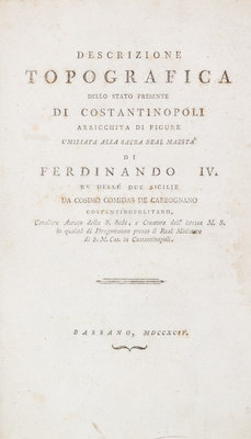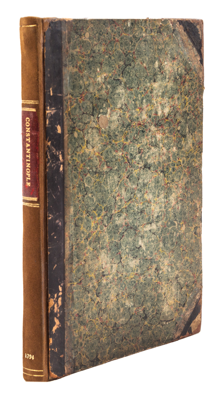 Descrizione topografica dello stato presente di Constantinopoli arricchita di figure umiliata alla sacra real maesta di Ferdinando IV.Bassano: s.n., 1794. 4to, quarter suede over marbled boards, rebacked, gilt-lettered red calf spine label. First edition. Complete with 26 folding and double-page engraved plates and maps. Wear to boards; scattered light foxing.