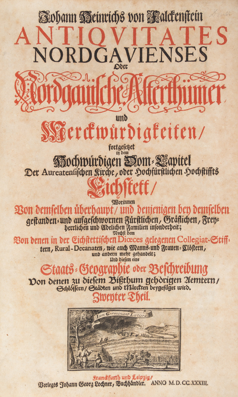Antiquitates Nordgavienses Oder Nordgauische Alterthumer und Merckwurdigkeiten, aufgesucht in der Aureatensischen Kirche, oder Hochfrstl. Frankfurt and Leipzig: Johann Georg Lochner, 1733.Folio, full vellum, title page in red and black, title in manuscript to spine. Soiling to boards; bookseller's stamp to front pastedown.