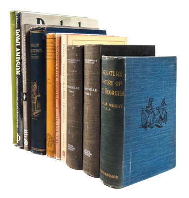 A collection of books pertaining to caricatures and caricaturing, in two boxes.