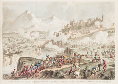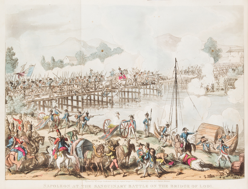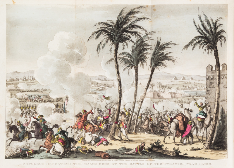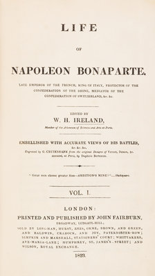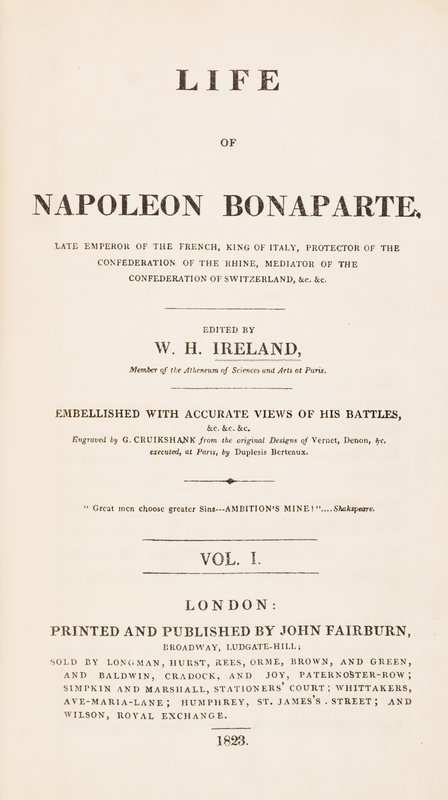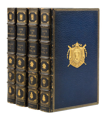 Life of Napoleon Bonaparte. London: John Fairburn, 1823-1828. 4 vols. 8vo, bound by Riviere & Son in full crushed blue morocco with gilt-stamped armorial crest design to boards, gilt-stamped and -lettered spines, t.e.g. Complete with 27 engraved folding plates (24 hand-coloured). Spines darkened; upper board detached from vol. 2; scattered brownspotting.