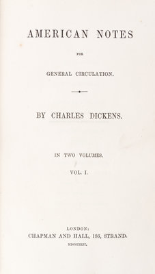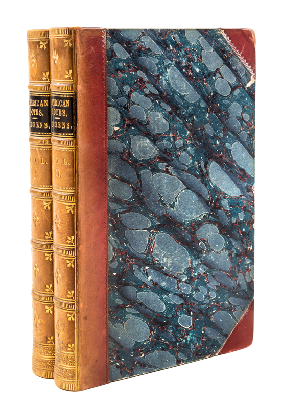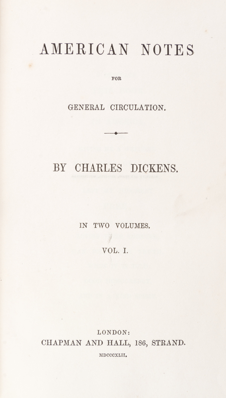 American Notes for General Circulation. London: Chapman and Hall, 1842.2 vols. 3/4 maroon calf over marbled boards, gilt-stamped and -lettered spines. First edition, first issue, with half-titles, contents, and second contents page in volume 1 misnumbered "xvi." Spines faded; light edgewear; scattered foxing.