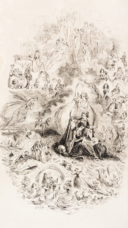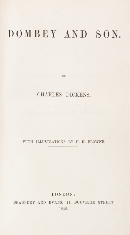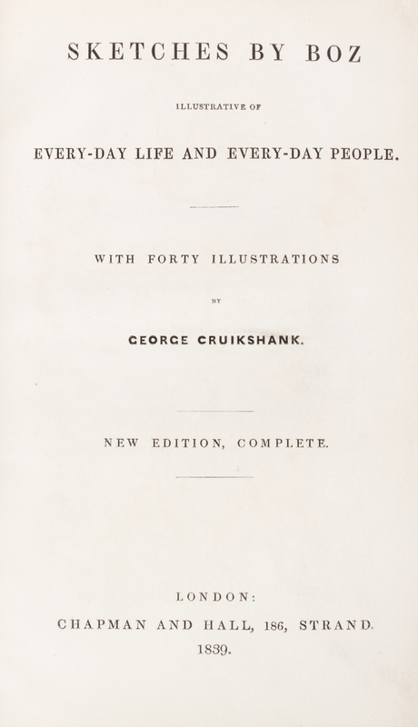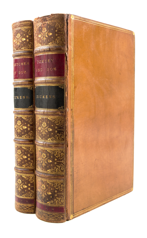 Sketches by Boz and Dombey and Son. London: Chapman and Hall, 1839 and 1848.2 vols. 8vo, uniformly bound in full tan calf, gilt-tooled and -lettered spines, red and green leather spine labels, gilt-inner dentelles, a.e.g. First combined edition (Boz) and First book edition (Dombey). Spines darkened; bookplates Colonel Arthur Hare Vincent tipped to front pastedowns; plates darkened; scattered brown spots.