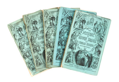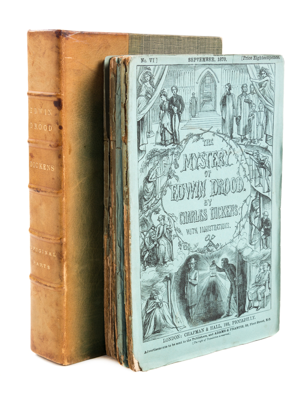 The Mystery of Edwin Drood. London: Chapman & Hall, May - September, 1870.5 (of 6) original monthly parts. 8vo, original blue-green wraps. Housed in quarter green calf over cloth clamshell case, gilt-lettered spine. First edition, first issue, earliest issue of part 6 with the "eighteenpence" slip pasted over the one shilling price on the front wrap, also including the often missing "Cork Hats" slip in part 2. With 12 engraved plates by S.L. Fildes. Calf on slipcase sunned; wrappers soiled and chipped at edges and spines; upper wrapper part 2 detached but present; intermittent brownspotting.
