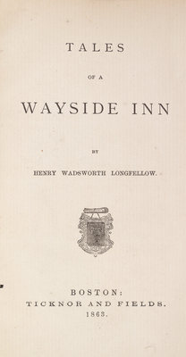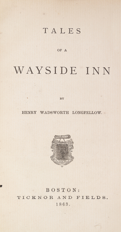 Tales of a Wayside Inn. Boston: Ticknor and Fields, 1863.8vo, original brown cloth, gilt-lettered spine. First American edition, first printing, with 22 pp. publisher's advertisements at rear dated "November 1863." Spine faded; ends bumped; previous owner's ex-libris to f.f.e.p.; few scattered brown spots.