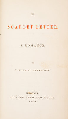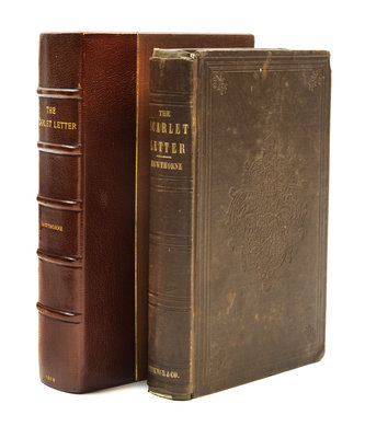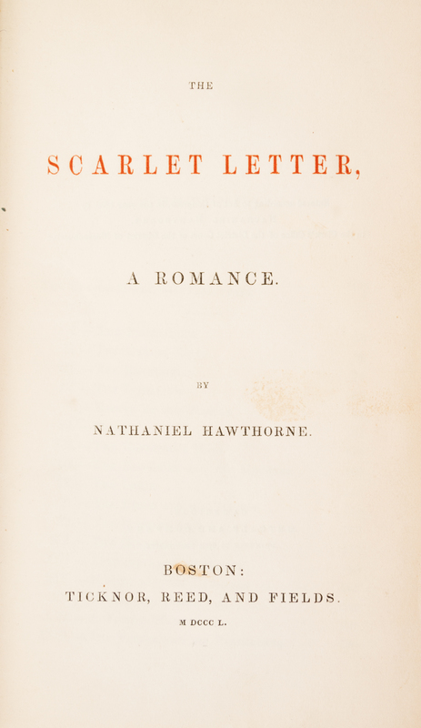 The Scarlet Letter, a Romance. Boston: Ticknor, Reed, and Fields, 1850.8vo, original blind-stamped brown cloth, gilt-lettered spine. Housed in cloth chemise and quarter morocco slipcase. First edition, with four pages publisher's advertisements dated March 1, 1850, inserted at front. One of only 2,500 copies printed. Minor rubbing to boards; light edgewear with 1/4-inch of loss to each end of spine; scattered brown spots; hinges starting.