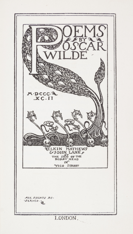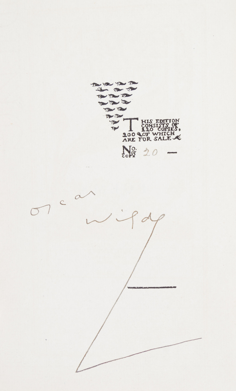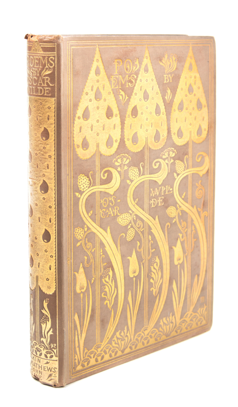 Poems. London: Elkin Mathews & John Lane at the Sign of the Bodley Head in Vigo Street, 1892.8vo, original cloth elaborately gilt-decorated after design by Charles Ricketts. Limited edition, number 20 of 220 copies, signed by Wilde on the limitation page. With woodcut title, endpapers, and woodcut ornament to limitation page by Charles Ricketts. Minor soiling to boards; front endpaper threatening to detach.