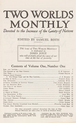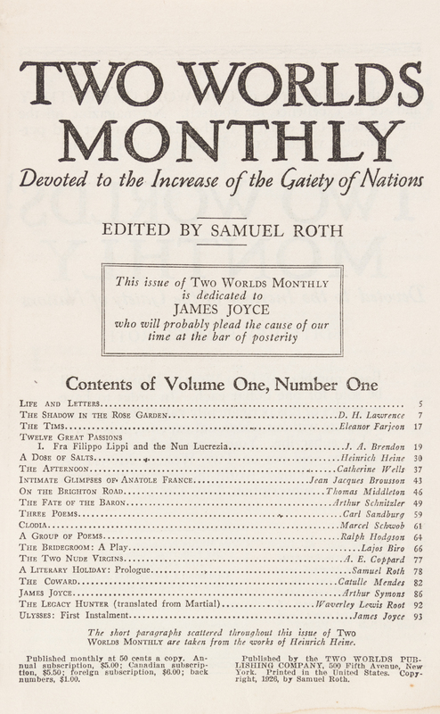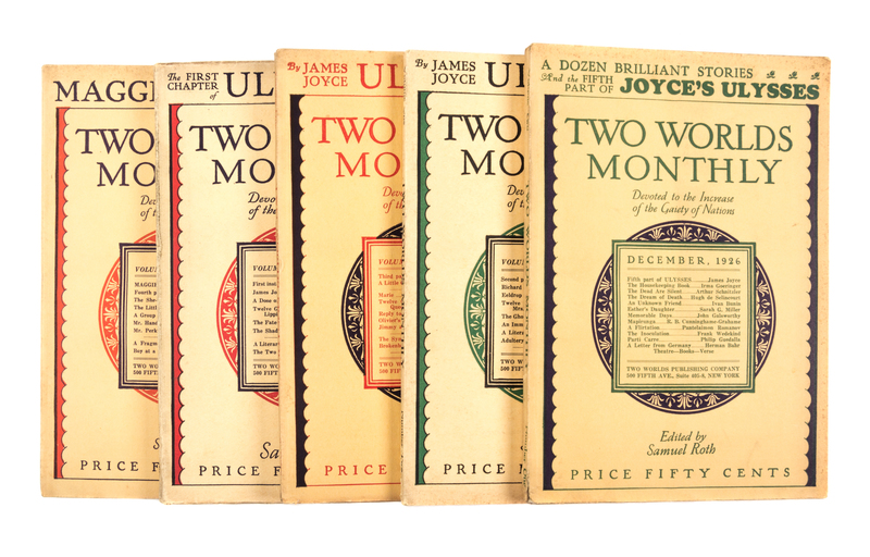 Ulysses [partial, as published in Two Worlds Monthly] New York: Two Worlds Publishing, 1926-1927. 5 (of 11) issues [comprising v. 1 (nos. 1-4) and v. 2 (no. 1). 8vo, publisher's printed wraps. Containing pirated excerpts from Joyce's Ulysses. The illegal publication led to Joyce suing the magazine's editor, Samuel Roth, and a printed protest against Roth signed by 167 prominent writers, artists and intellectuals, including T.S. Eliot, W.B. Yeats, Gertrude Stein, and Albert Einstein.