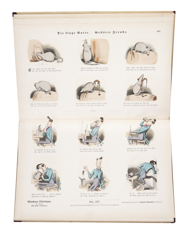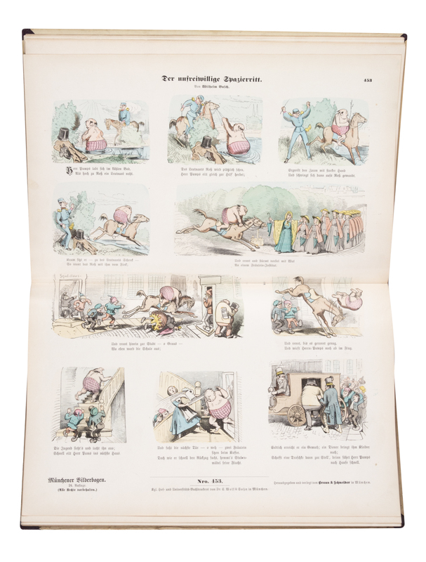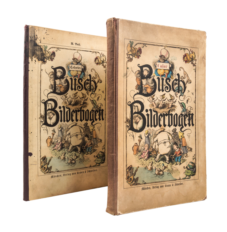 Color. Busch Bilderbogen. [and] Colorirt. Busch Bilderbogen. Munich: Verlag von Braun & Schneider, n.d. [c. 1890]Folio, original quarter brown cloth over pictorial boards. With numerous double-page color illustrations throughout. Wear and soiling to boards; marginal chipping to plates; some leaves detached.