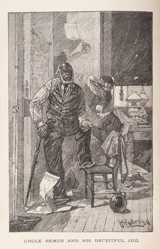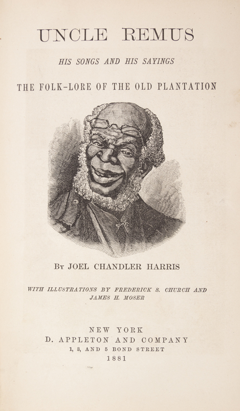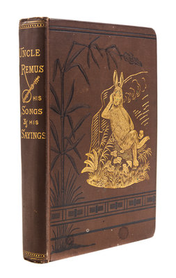 Uncle Remus: His Songs and Sayings. New York: D. Appleton, 1881.8vo, original pictorially gilt-stamped brown cloth. First edition, first issue with butterfly endpapers, the "presumptive" reading on p.9, and no mention of this title in the 8pp. publisher's ads at rear. Minor edgewear and soiling to boards; text block leaning; hinges starting.