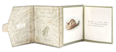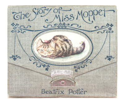 The Story of Miss Moppet. New York and London: Frederick Warne, [1906]16mo, original grey-blue cloth wallet-style binding with mounted color illustration and imitation clasp to upper cover. First edition, first American issue. Complete with 14 full-page linen-backed color illustrations. Light soiling to boards; some spotting to linen; hinges starting.